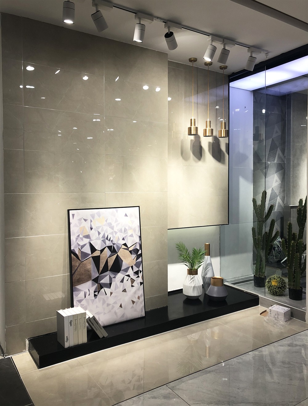墙砖可作客厅电视背景墙、沙发背景墙、地砖使用。个性的切割搭配方式,金属的软装运用,营造质感的空间。