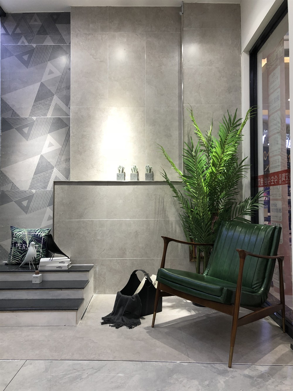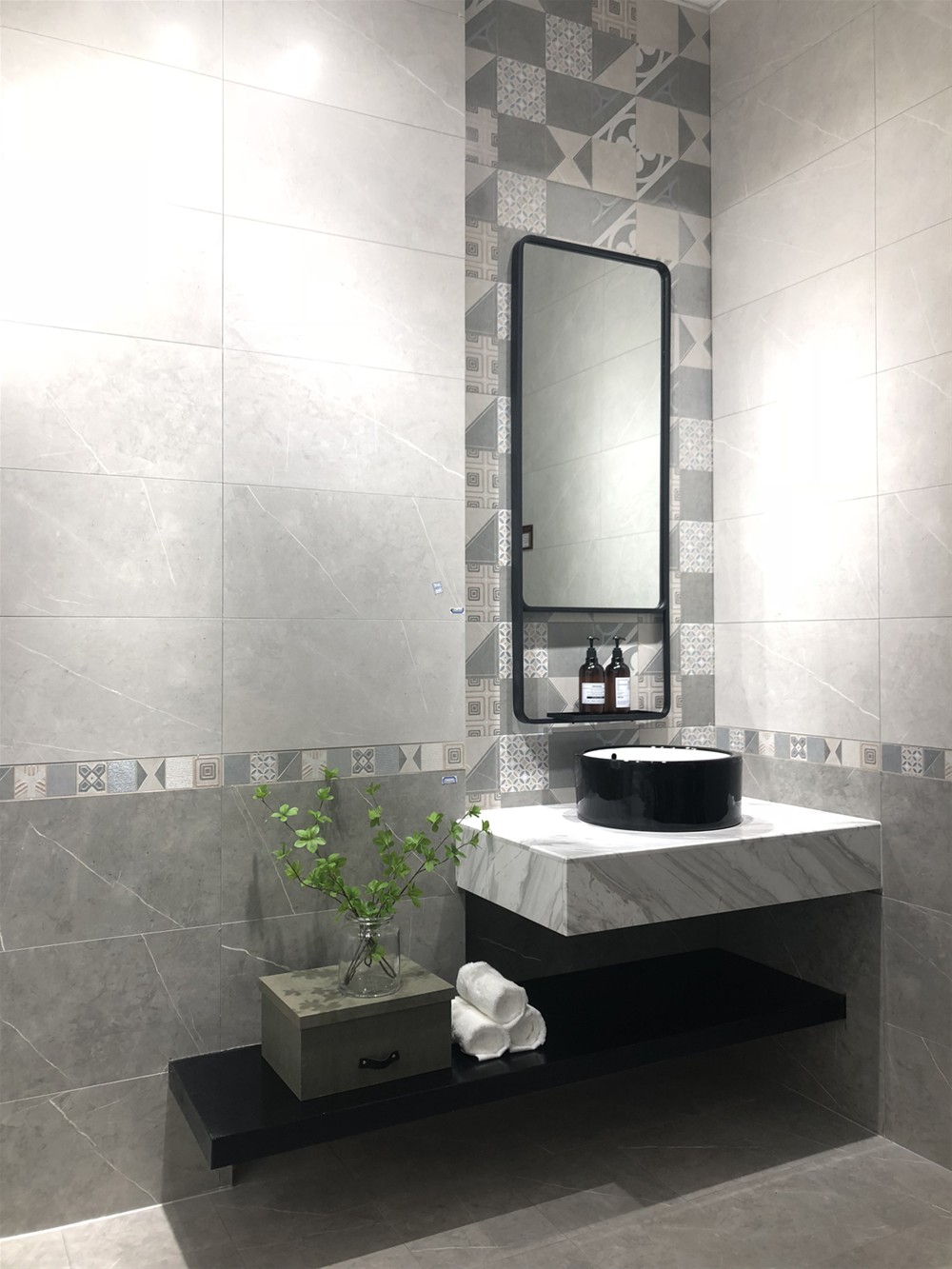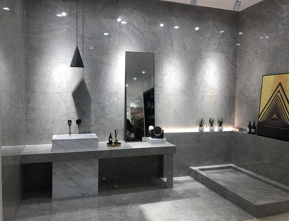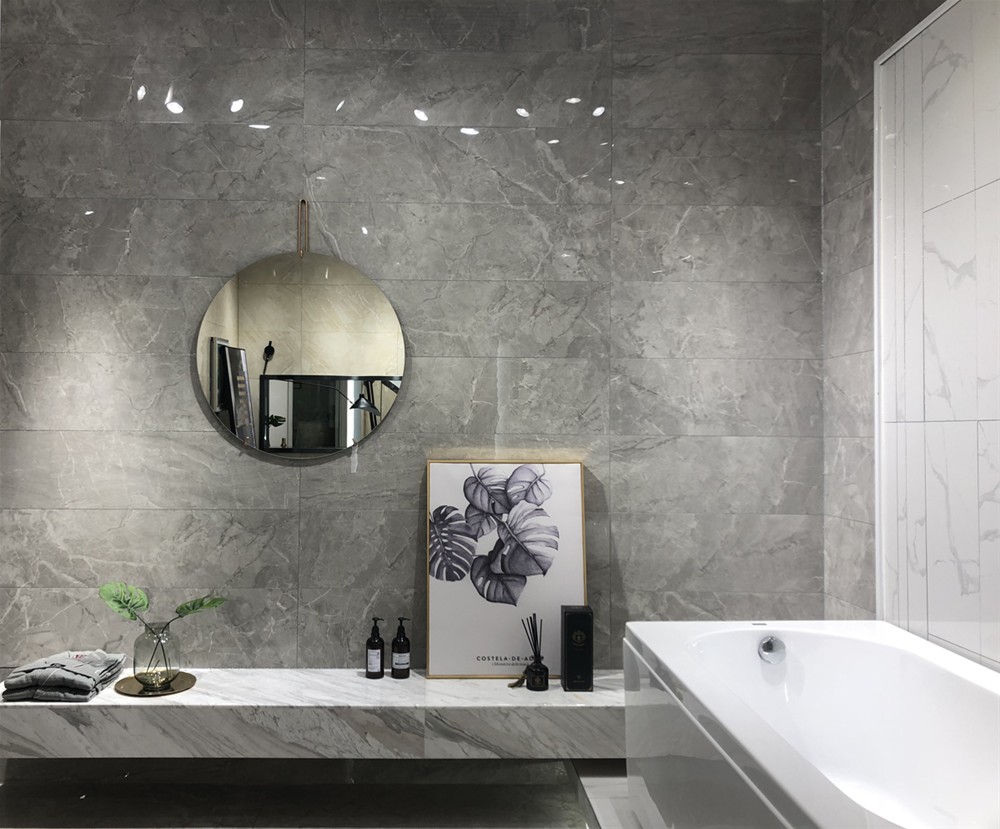 墙面可作电视背景墙、客厅地砖、沙发背景墙、厨卫用砖。高级灰亮面砖深受年轻人喜爱,也很好搭配突出空间效果。
