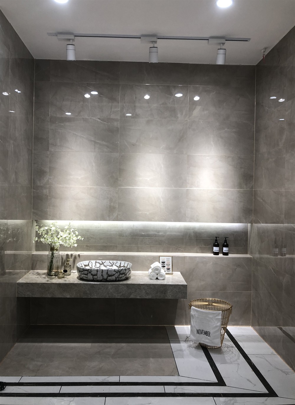 这是大板的选材区,选用打竖的陈列方式,射灯照射下的产品,干净、整洁、大气、直观。