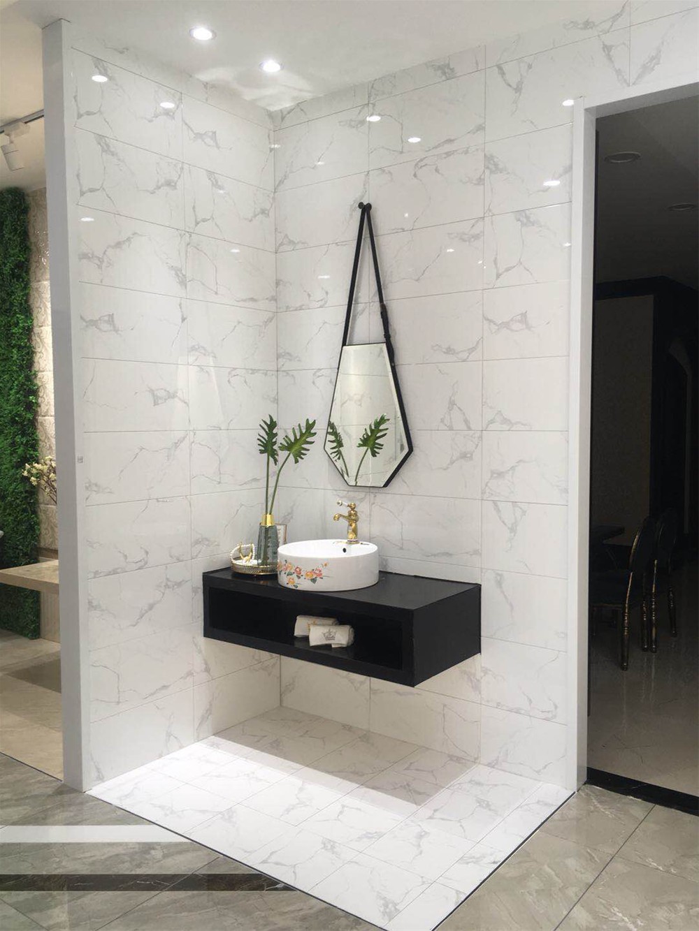 墙面可作沙发背景墙、电视背景墙、厨卫墙面和客厅地砖使用。亮面砖很好地提亮整个空间的光感。