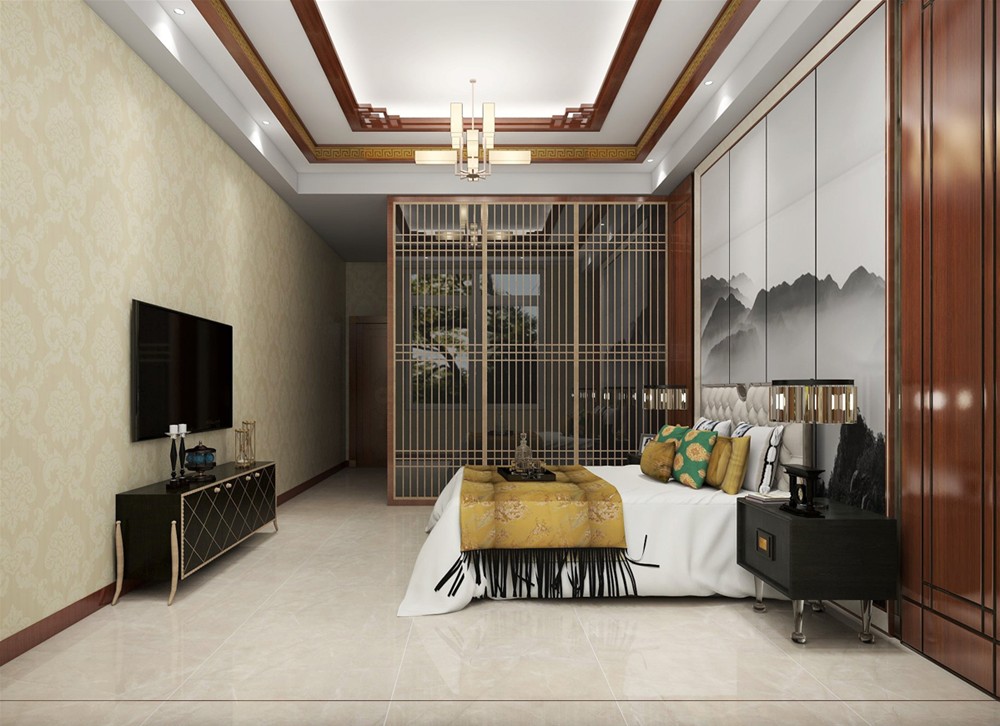 主卧床背景仍利用木色为主构架融会贯通,再加以富有意境的山水壁画作为更深层的点缀,让人们在整个空间里感受传统文化带来的熏陶与动感,生命也变得温润充盈,富有韵味。