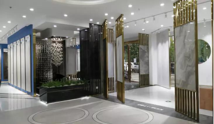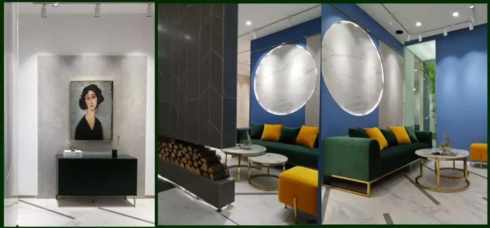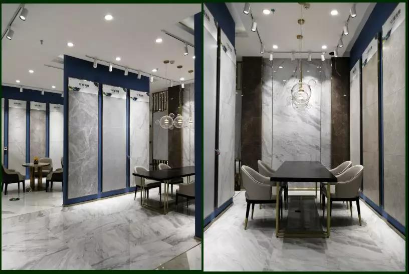 900*1800的大板以屏风的形式展现,不但很巧妙的体现了大岩板系列产品的纹理和设计感,而且通过系列的屏风展示很巧妙的把大堂区域两边划分为接待区和洽谈区,静/动两个区。