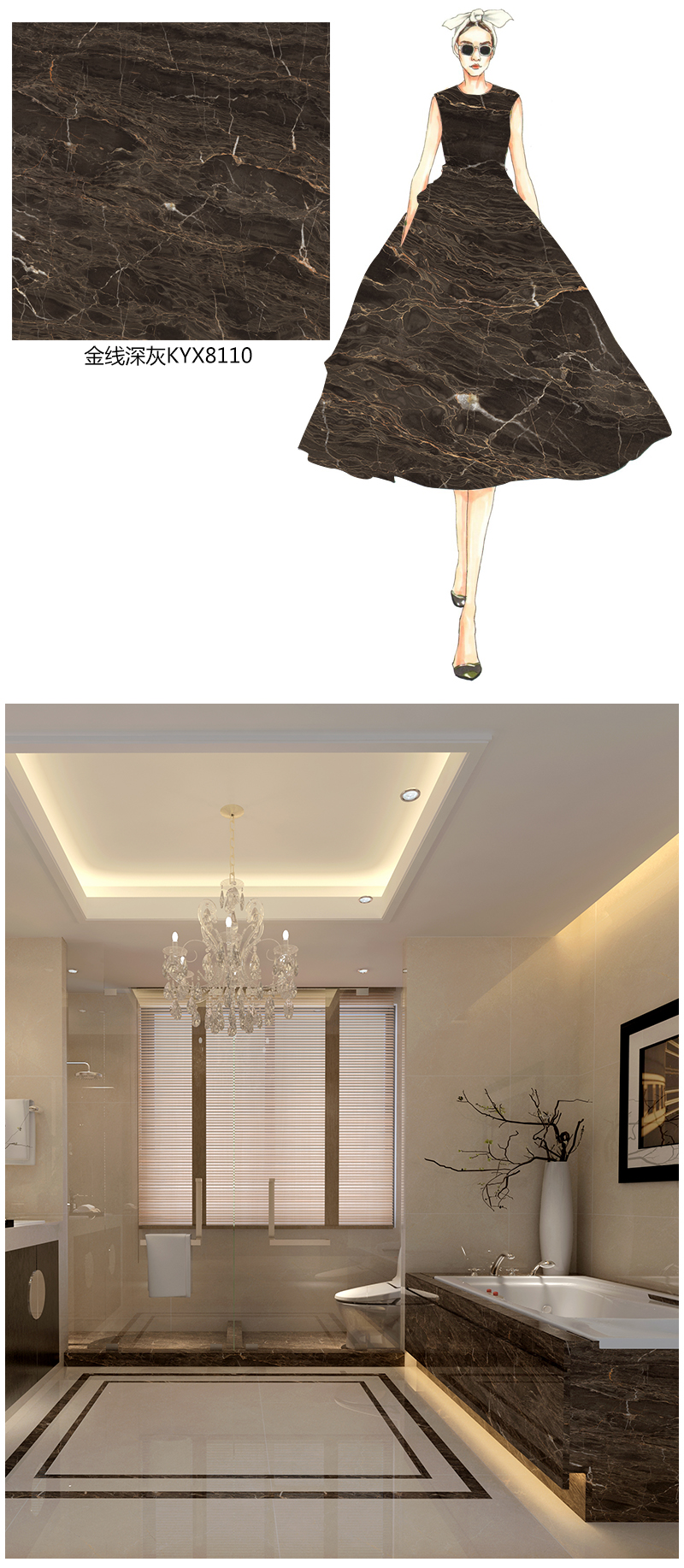 金艾陶金线深灰,将错落有致的纹理溶入柔和的灰色里,花纹均匀细致,光泽度高,将委婉的柔美呈现在空间里,装饰空间具有独特的奢华和柔和。