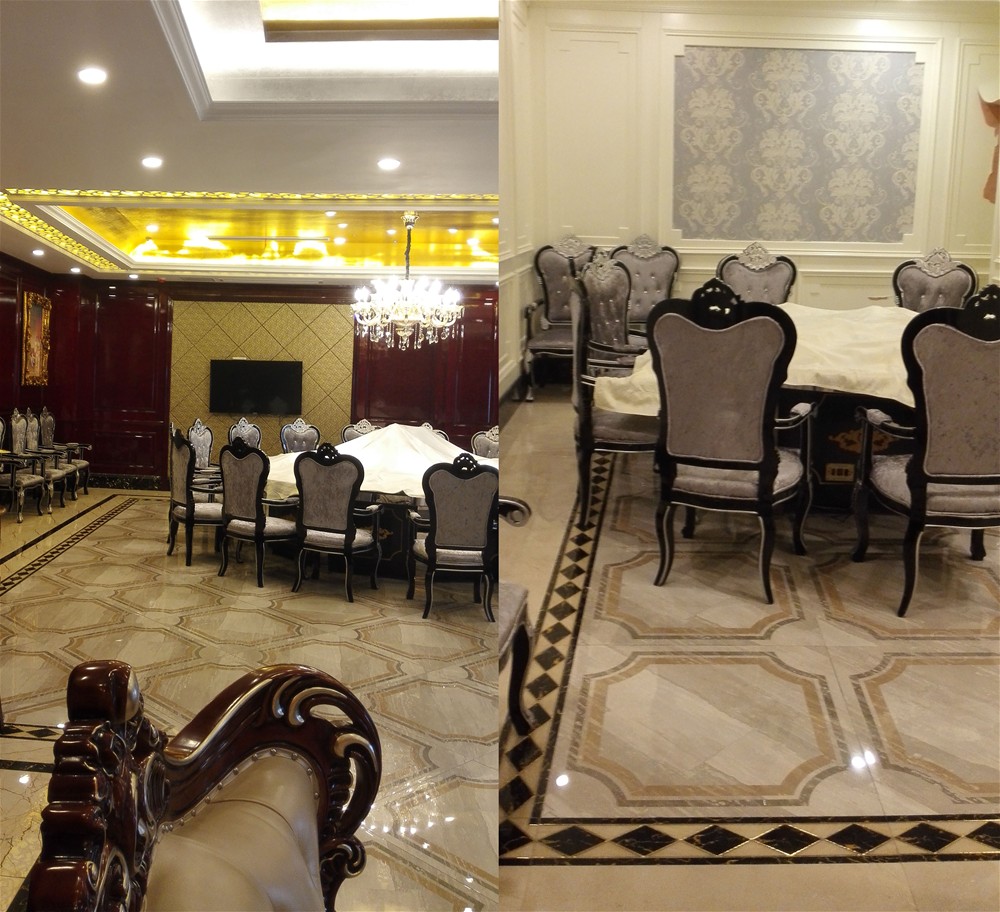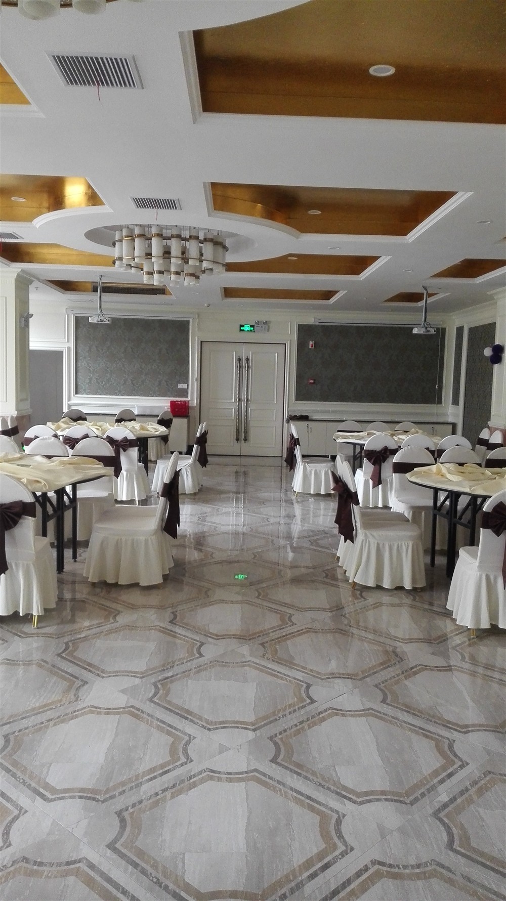 盐城东林海岸大酒店内部装饰,全部采用金艾陶瓷砖的产品进行装饰铺贴。餐厅及包间应用了金艾陶瓷砖爱丁堡系列拼花KYP8055H、KYP8062H、KYP8069H和爱特大理石金黄天龙KYP8085,包间茶水间墙面采用曼彩时尚KPM36053铺贴。酒店过道则采用爱特大理石金黄天龙KYP8085与黑金花KYB8017进行搭配。
