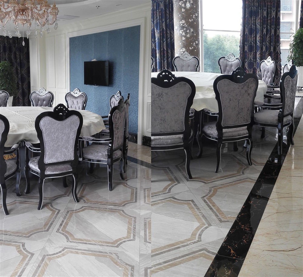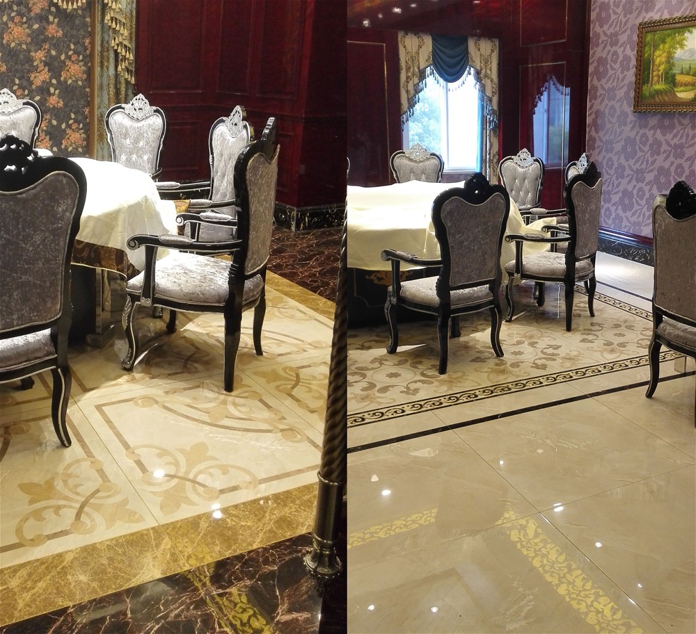 以金艾陶爱丁堡系列拼花KYP8055H、KYP8062H、KYP8069H作为主要装饰材料,再加上爱特大理石黑金花KYB8017与金黄天龙KYP8085的装饰和衬托,使地面的瓷砖更加富于变化,视角效果更加丰富。周围花纹的衬托,地面整体成“淡黄与黑”搭配的空间效果,给人一种高端华丽的感觉,令人赏心悦目。