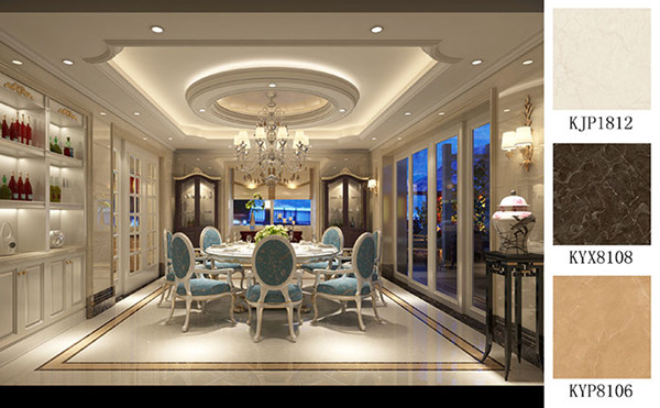 整个空间以浅色调为主,餐椅的一抹浅蓝实现了整个空间色调的跳跃,更具韵味。地面主要铺贴金刚釉瓷砖水晶玫瑰KJP1812、搭配大理石瓷砖金王啡KYX8108、大理石瓷砖金世纪米黄KYP8106,与整体格调相辅相成,自然舒适。天花造型方中有圆,精美的水晶吊灯镶嵌其中,奢华大气,雍容华贵!
