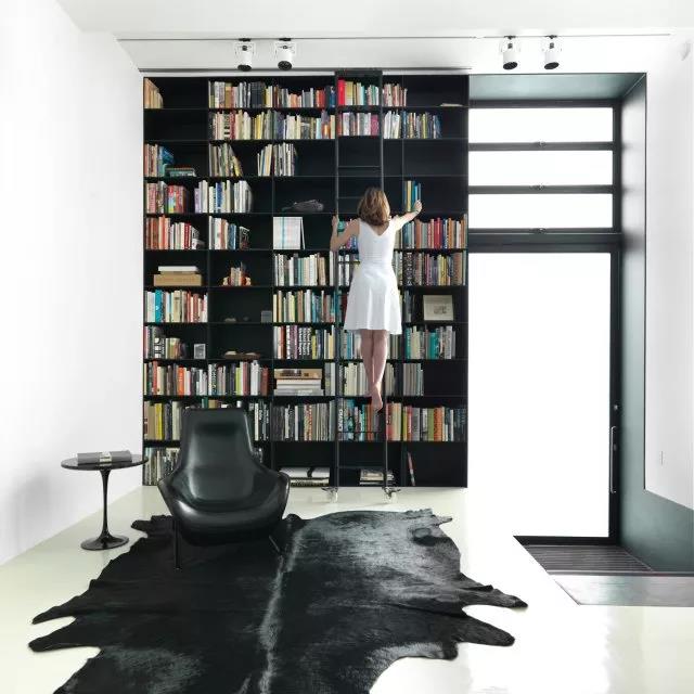 房顶高的屋子大气舒适,将书柜一直延伸至房顶,适合存书量非常多家庭,当然存放一些影碟或者红酒也是不错的。