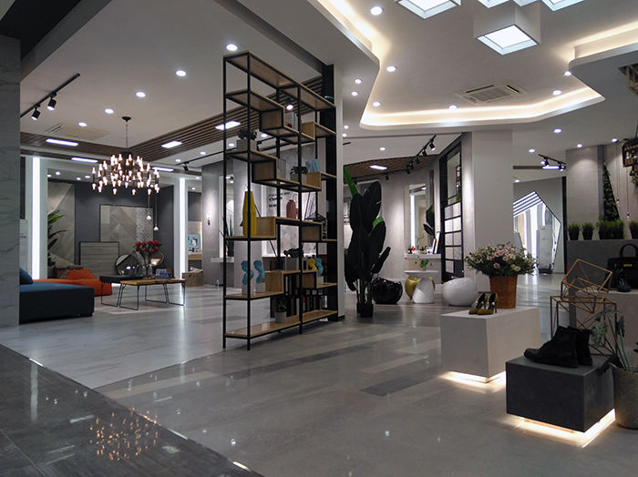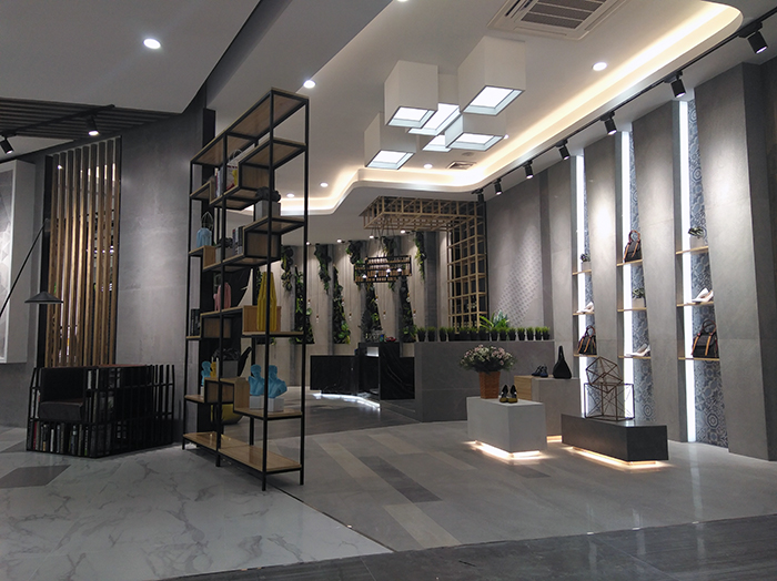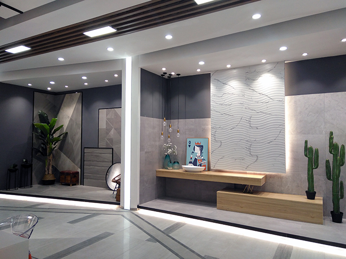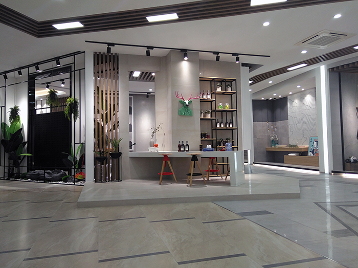 新展厅主要运用现代仿古砖阿玛罗尼、15°缎光釉产品,主打现代简约风格,个性独特的灯饰,沉稳大