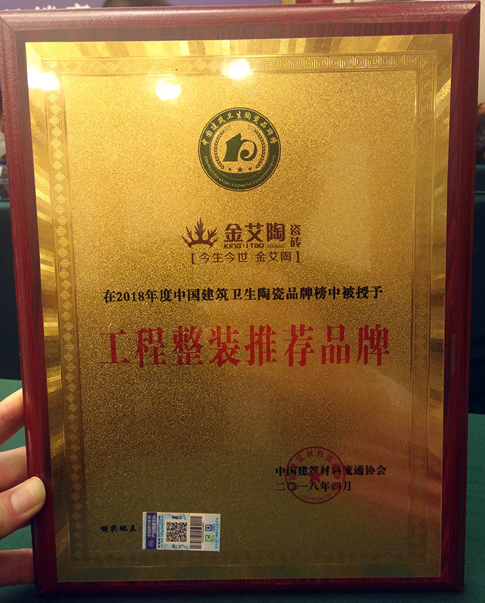 作为陶瓷行业后起之秀的金艾陶瓷砖品牌喜获“陶瓷一线品牌”、“现代仿古砖十大品牌”、“缎光釉领军品牌”、“设计师推荐品牌”、“工程整装推荐品牌”等多项殊荣,其中更是连续五年获得“陶瓷一线品牌”荣誉。在本次“行业两会”的评选中,金艾陶瓷砖品牌能够在众多知名陶瓷企业中脱颖而出,证明金艾陶又一次获得了行业内外的肯定。