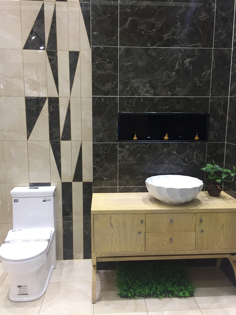 卫生间模拟间:由通体大理石金王啡KTB8018与冰帕玉KTA8305搭配铺设,一深一浅搭配出空间层次感,三角形与矩形相互交错,让空间个性不单调。