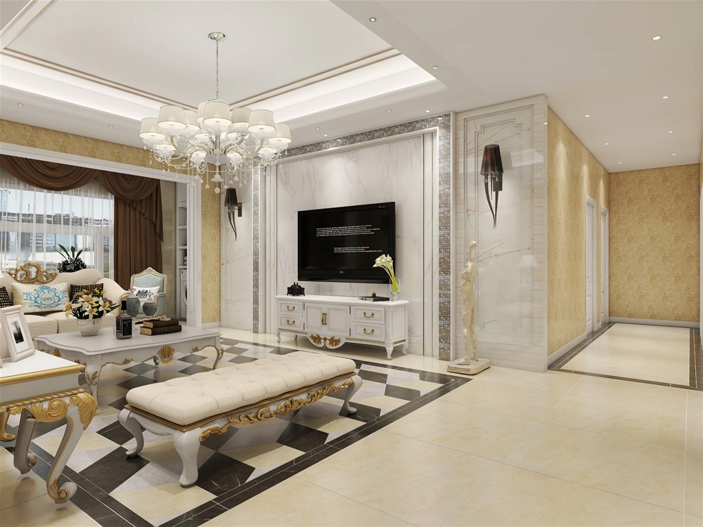 由仿大理石纹理15°缎光釉瓷砖装饰的电视墙,纹理清晰、素雅,地砖由三个颜色铺设的立体图形,让地面更有立体感和设计感。沙发、茶几、电视柜等家具雕饰简洁,更具轻奢感。灯饰摒弃繁杂的水晶吊灯采用相对线条简化的吊灯,完美演绎简欧轻奢品味。