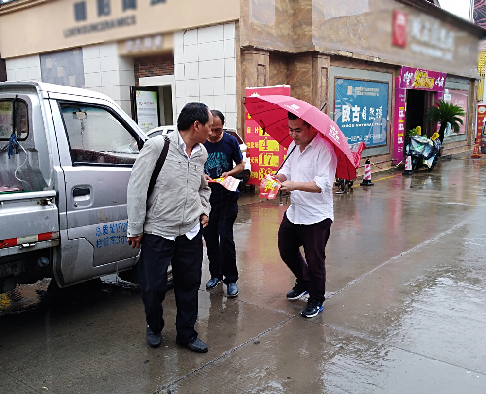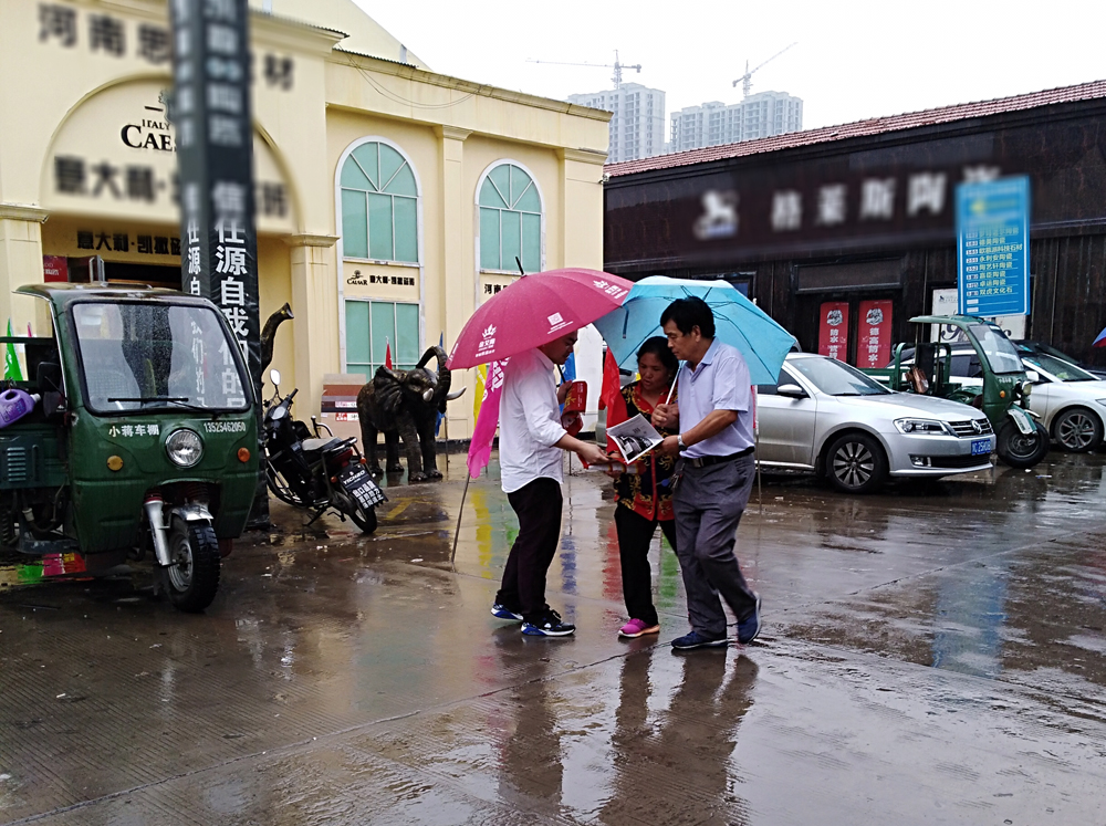 9月15日当天,金艾陶策划人员黄经理到达洛阳专卖店,与高经理一起带领河南洛阳全体店员到商场、步行街、卖场附近派发传单。即使是下着雨,也依然坚持撑着伞走过大街小巷,不放过任何一个机会,为金艾陶一线人员点赞,是你们的付出让这次开业取得卓越的成绩。