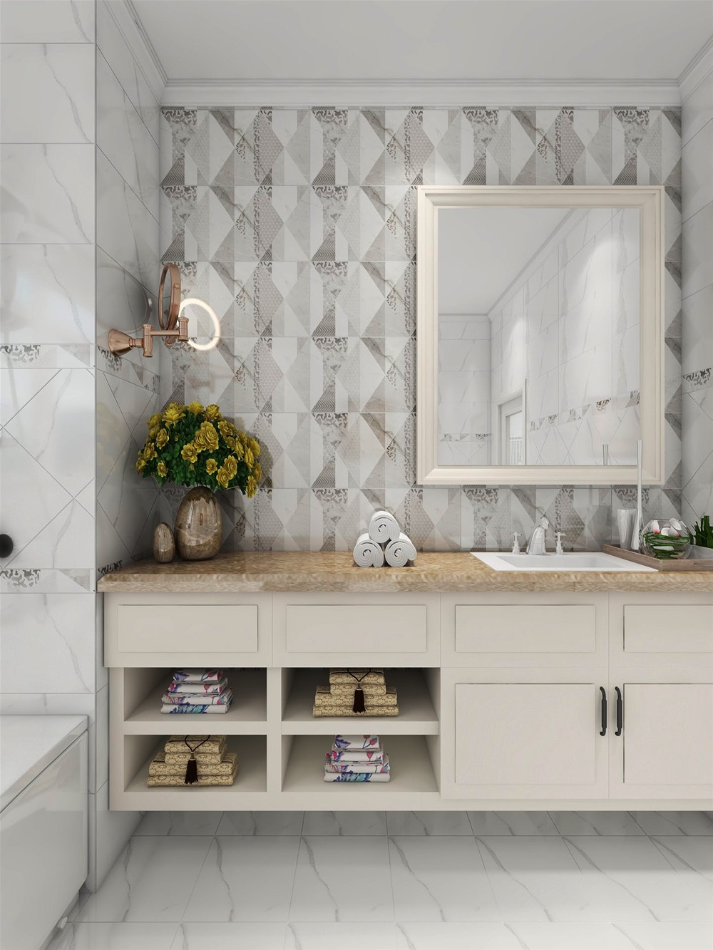 整体空间采用白色大理石纹理喷墨瓷片,布局宽敞明亮,几何图形的瓷片墙面,让沐浴区与洗手台有了巧妙的区分。米黄色大理石纹理的洗手台耐脏,洗手台下是多功能的储物柜,有拉式柜桶也有开放式柜桶,考虑得十分周到。